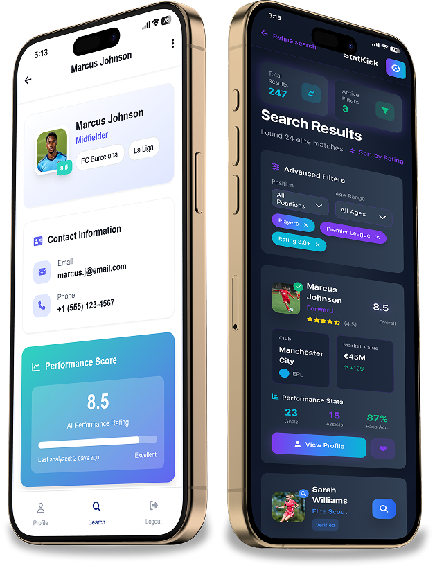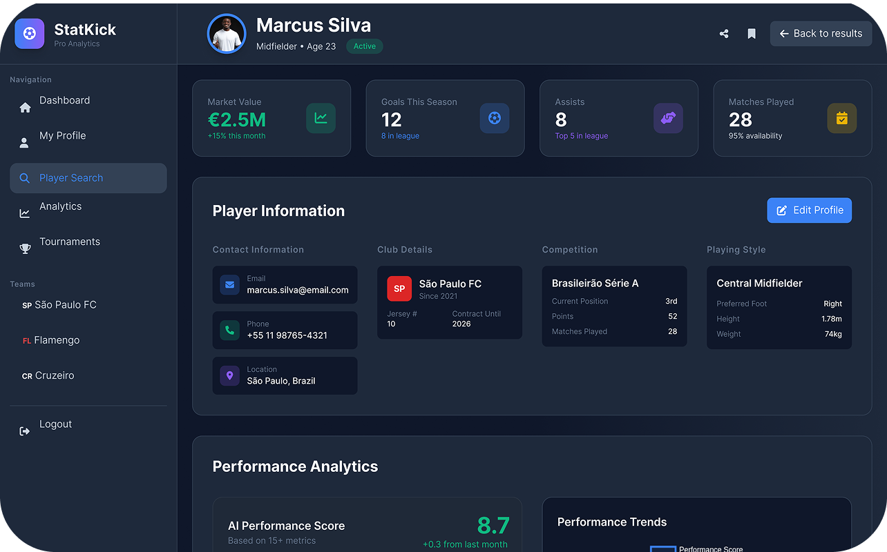 We developed a platform that analyzes soccer videos with AI, giving players performance scores and helping scouts discover new talent through real data.